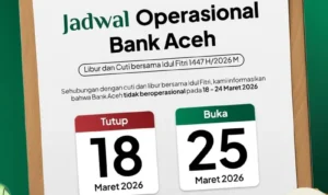 Banda Aceh– Menyambut momentum Hari Raya Idul Fitri 1447 Hijriah, Bank Aceh resmi mengumumkan penyesuaian jadwal operasional layanan perbankan. Kebijakan ini dilakukan seiring dengan penetapan libur dan cuti bersama nasional dalam rangka perayaan Idul Fitri tahun 2026.